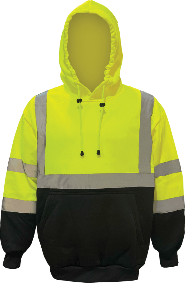 Meets ANSI/ISEA 107-2020 Class 3 Standards. Roomy Front Pocket. Oversized Hoods. Ribbed Cuffs. Black High Wear Areas. Drawstring Hood